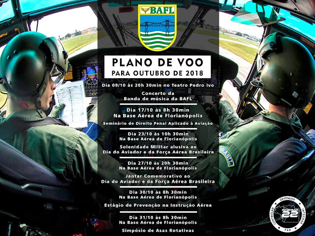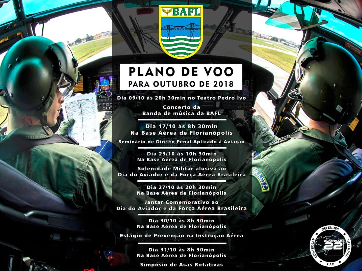 Outubro é marcado pela comemoração do Dia do Aviador (23/10). Comemora-se também o Dia Mundial do Controlador de Tráfego Aéreo (20/10) e o Dia da Engenharia da Aeronáutica (28/10).A Base Aérea de Florianópolis, atualmente comandada pelo Tenente Coronel Luiz dos Santos Alves, traça sua descendência do antigo Centro de Aviação Naval, criado a 10 de maio de 1923 para atender as atividades da antiga Aviação Naval. Sua história confunde-se com a própria história de Santa Catarina e de sua capital, tendo, em seus primórdios, o privilégio de ser indicada como lugar ideal para campo de aviação pelos legendários pilotos franceses Hermoz, Saint-Exupery e Guillamet, que por Florianópolis passavam, implantando com seus vôos transatlânticos, o “Correio do Sul”, fazendo seus pousos no então Campo do Campeche.