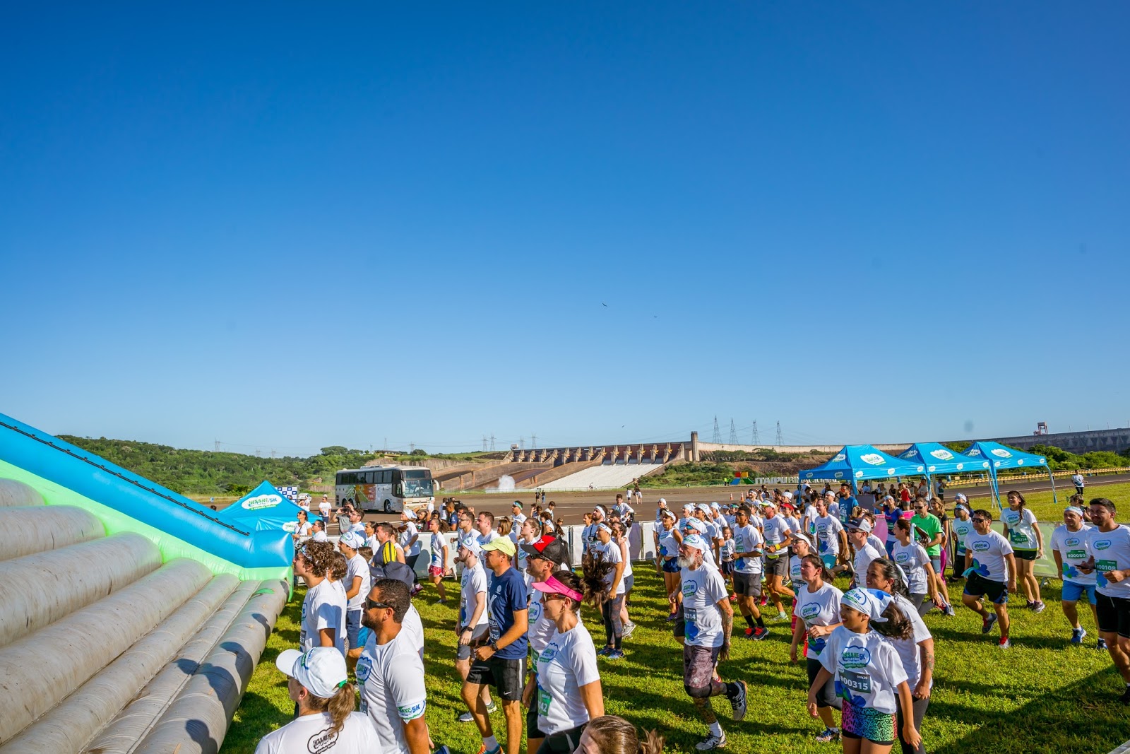 A prova teve várias largadas, feitas em blocos de até 170 pessoas. O primeiro grupo partiu às 8h. Já na saída, o primeiro desafio: escalar um tobogã de quase cinco metros de altura, com um formato semelhante ao do vertedouro de Itaipu, que prossegue com a calha esquerda aberta neste domingo. O espetáculo das águas ajudou a deixar o cenário ainda mais atrativo para os participantes. Pela manhã, o vertimento chegou a 1.442 metros cúbicos por segundo (ou 1,4 milhão de litros de água), o equivalente a vazão média das Cataratas do Iguaçu.