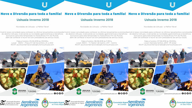 Falando nisso, o Secretário de Turismo de Ushuaia, Juan Sherañuk, informa que sua equipe está chegando ao Brasil, juntamente com demais empresários, reforçando ainda mais essa temporada. Trazem mais novidades, benefícios e promoções. As reuniões aconteceram com o apoio da Aerolineas Argentinas, Consulado Argentino e ABAV em Porto Alegre, Curitiba e São Paulo.