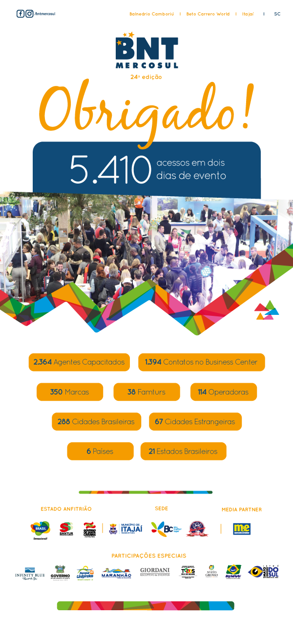 A maior feira de turismo de Santa Catarina, a BNT Mercosul, que aconteceu entre os dias 25 e 16 passados, em Itajaú, Balneário Camboriú e Parque Beto Carrero World, recebeu 5410 visitantes. Geninho Góes, CEO da BNT, mesmo com a greve que está paralisando com muita razão o Brasil, ficou satisfeito com mais esta edição, afirmando que diante das circunstâncias, o evento foi melhor do que o esperado. 38 famturs e profissionais do trade de seis países, 21 estados e 288 cidades circularam pelos corredores da BNT Mercosul, num total de 350 expositores. Além disso, Mais de dois mil agentes participaram doa treinamentos. “Neste ano tivemos oo corredores abertos e não mais o formato labirinto que vinha de outros anos. Essa mudança e a chegada das capacitações são dois dos acertos que tivemos em 2018”, avaliou Geninho.