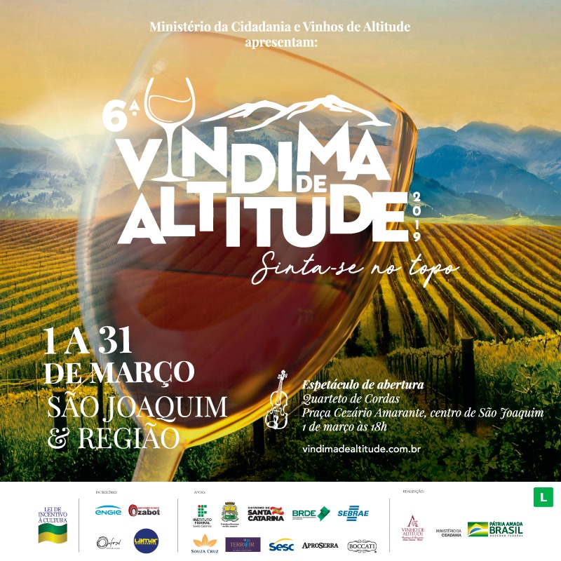 A sexta Vindima de Altitude de Santa Catarina, onde se prevê ótima safra de uva com 1 milhão de quilos, será realizada de 1º a 31 de março em meio a um mix irresistível de paisagens naturais, com montanhas e clima de inverno europeu. Os organizadores reservaram aos visitantes uma intensa programação a partir da abertura dos festejos na primeira sexta-feira de março, na Praça Cezário Amarante, no centro de São Joaquim, combinando com perfeição a beleza natural com os premiados vinhos produzidos em lugares cinematográficos e a vibração cultural em um dos principais polos turísticos do Brasil.